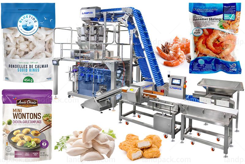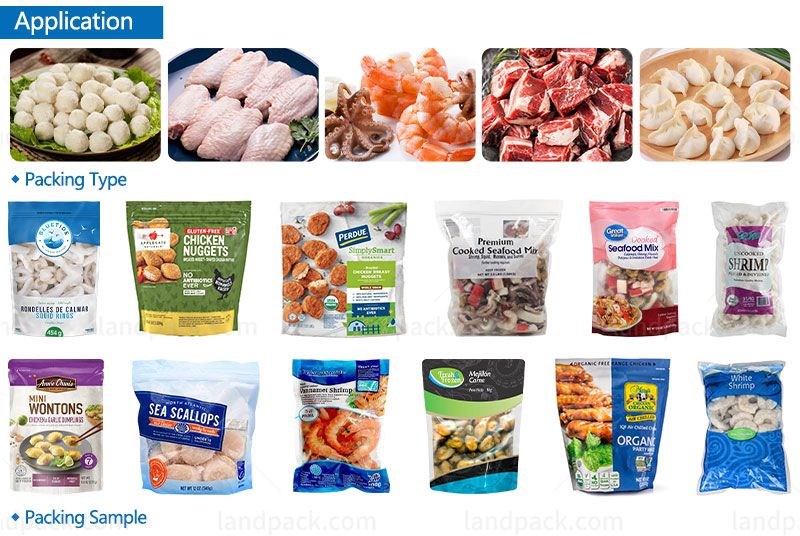The machine can pack different frozen food products which need pack in stand up pouch such as coffee, frozen food, biscuits, cereals, nuts, potato chips, jerky, vegetable, fruit, powdered materials, candy, etc.
