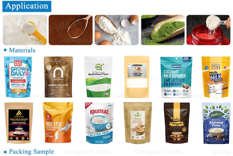 Automatic horizontal premade stand up pouch doypack powder packing machine is suitable for powder material: milk powder, tea powder, bakery powder, spices, coffee powder, medical powder, etc.