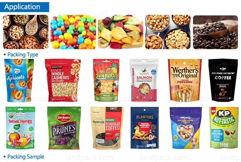 Suitable to use in packing high accuracy and easily fragile material. Such as dried fruit, apple slices, nuts, pet food, puffy food, chips, jelly, candy, pistachio nuts, frozen dumplings, coffee beans, pasta, cotton candy, french fries, rice, small hardware, etc.