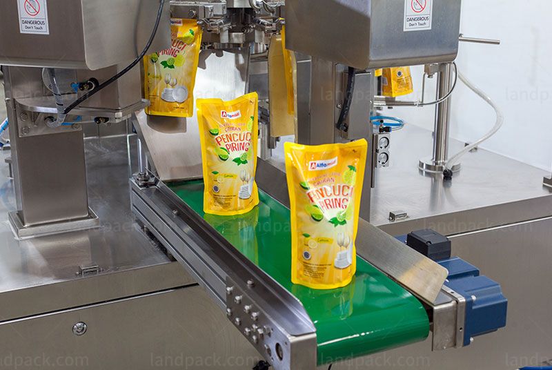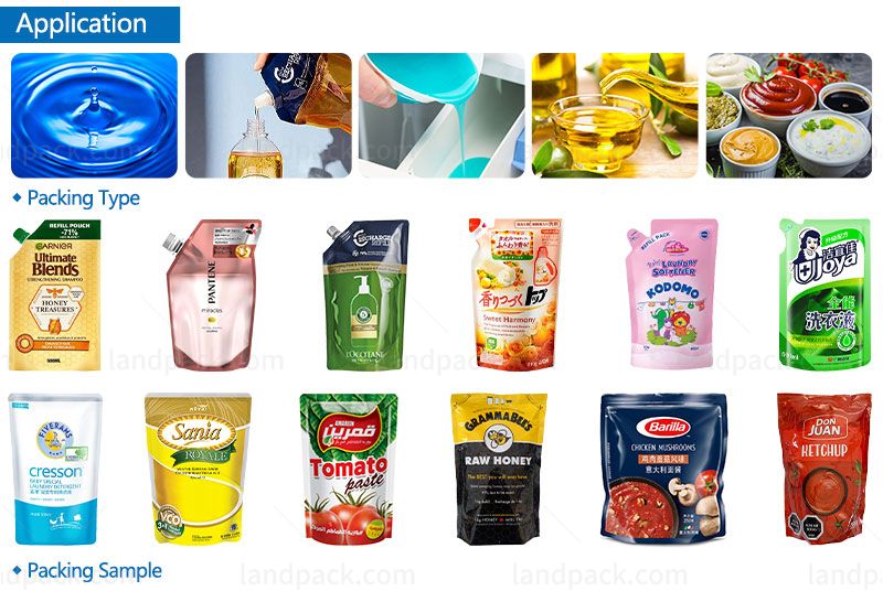 This Stand Up Pouch Automatic Liquid Packaging Machine is suitable for all kinds of liquid packing , such as sauce, rice vinegar, fruit juice, beverage, tomato sauce, peanut butter, jam, paste, etc.