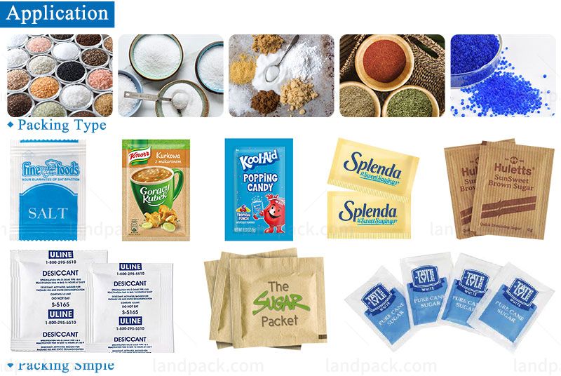 It is suitable for packaging fine particles with good uniformity, such as sugar, salt, snus, oatmeal, salt, seeds, rice, sesame, glucose, coffee powder, etc.