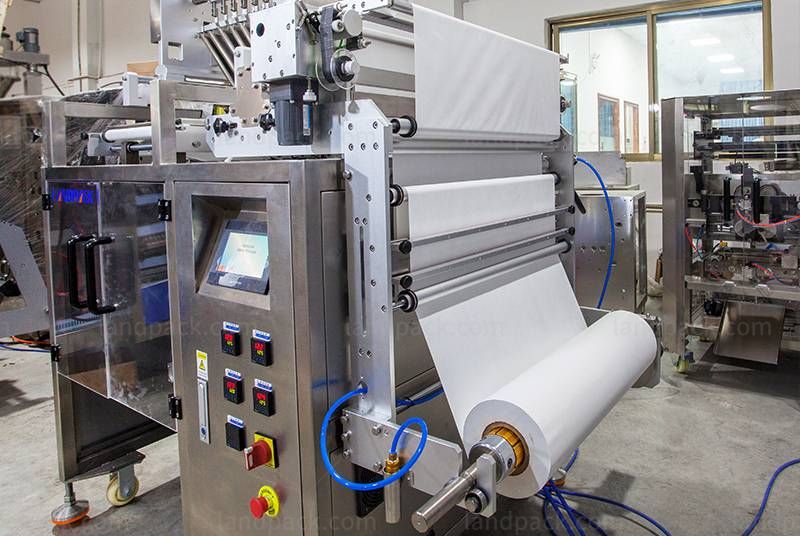 A high degree of automation, machine can finish packing at one time from longitudinal sealing, longitudinal cutting, transverse sealing, filling, embossing, notch cutting, cutting dotted line cutting, and transverse cutting to outputting finished sachets.