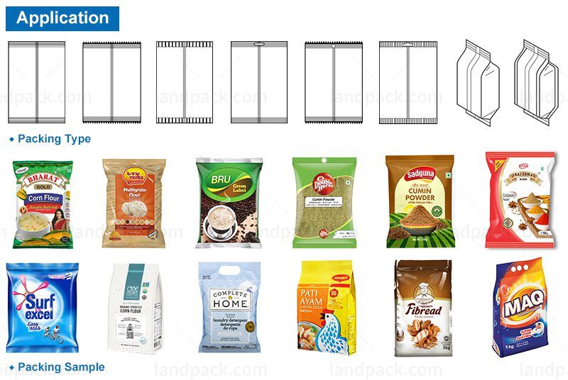 Suitable for packing fine dry powder materials, such as milk powder, spices powder, coffee powder, corn flour, laundry powder, coconut powder, fruit powder, collagen protein powder, cocoa powder, chilli powder, etc. It integrates metering, bagging, packing, sealing, date printing and counting into one.