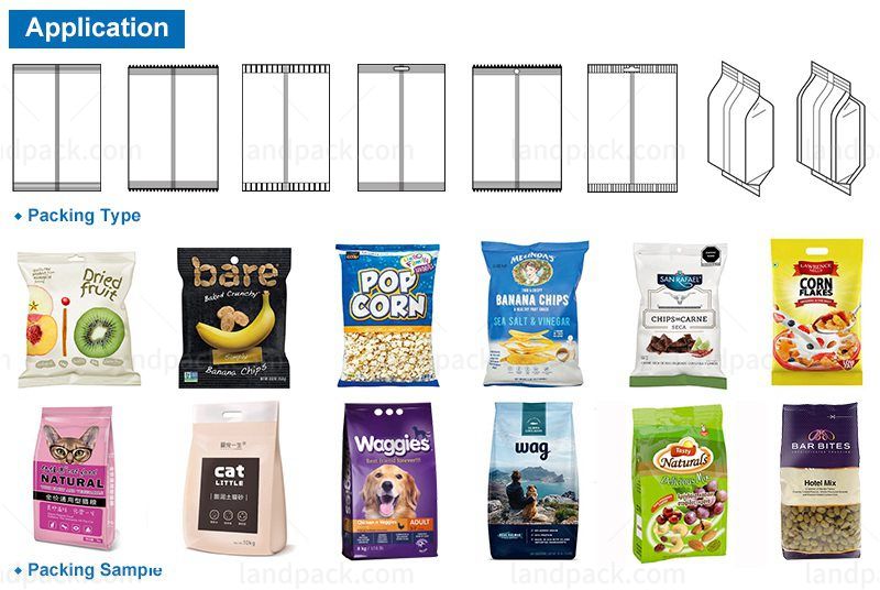Suitable for packing and weighing many kinds of products such as: puffy food, shrimp roll,peanut, shrimp chips, popcorn, cornmeal, seed and sugar,etc. which shape is roll, slice and granule.