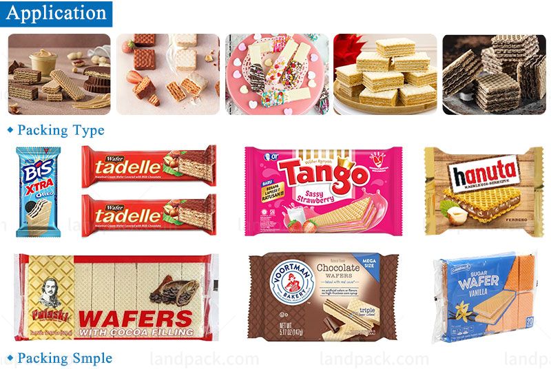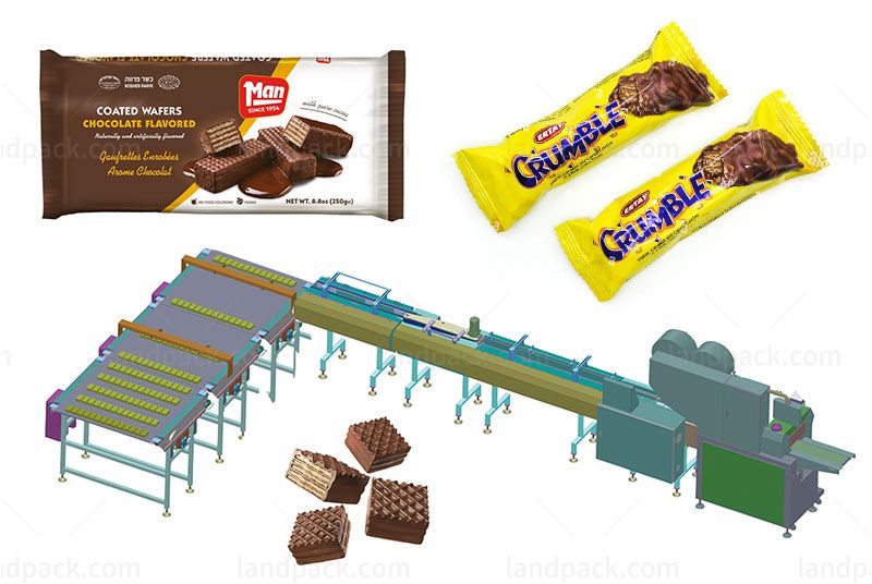 This feeding, sorting, and wrapping machine line is designed for pillow packing various types of wafers, including vanilla wafers, chocolate wafers, hazelnut wafers, almond wafers, coffee wafers, and more.