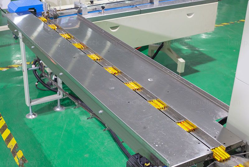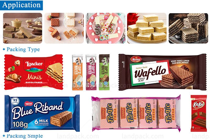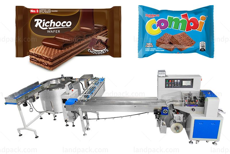 The turntable feeding and packaging line effectively utilizes limited space and is easy to operate. It is suitable for packaging non-breakable items and sticks, such as chocolate-covered wafers, vanilla wafers, strawberry wafers, and more.