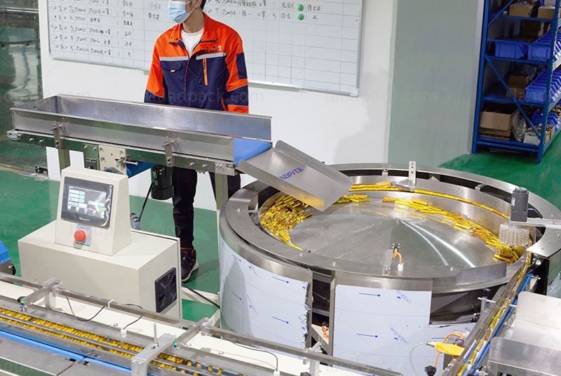 1. The materials are separated by the centrifugal force of the turntable, and the materials are discharged one by one, and the materials are sent to the packaging machine for packaging through the tail rack.