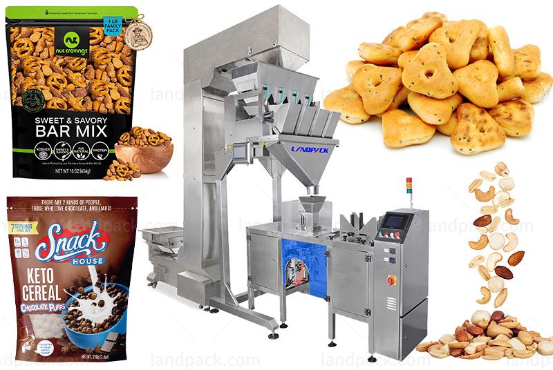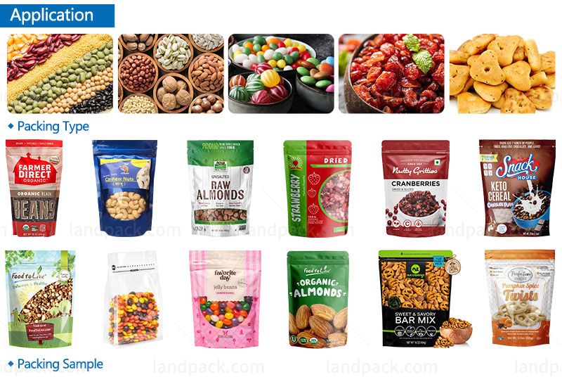 Suitable for various granule materials in premade pouch style, such as beans, nuts, dry fruits, candy, cereal, chocolate, biscuits, peanuts, capsules, seeds, chemicals, sugar, etc.